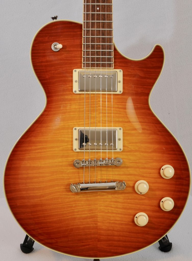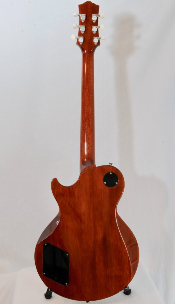 This baby features a 1-Piece Honduran Mahogany Body & a PREMIUM Flame Maple Top (finished in Iced Tea). Medium Frets (standard on this model) and a 24-7/8″ Scale with a 1-11/16″ Width. The Medium-Fat C measures .86″ – 1.01″ and the fretboard is MADAGASCAR ROSEWOOD.