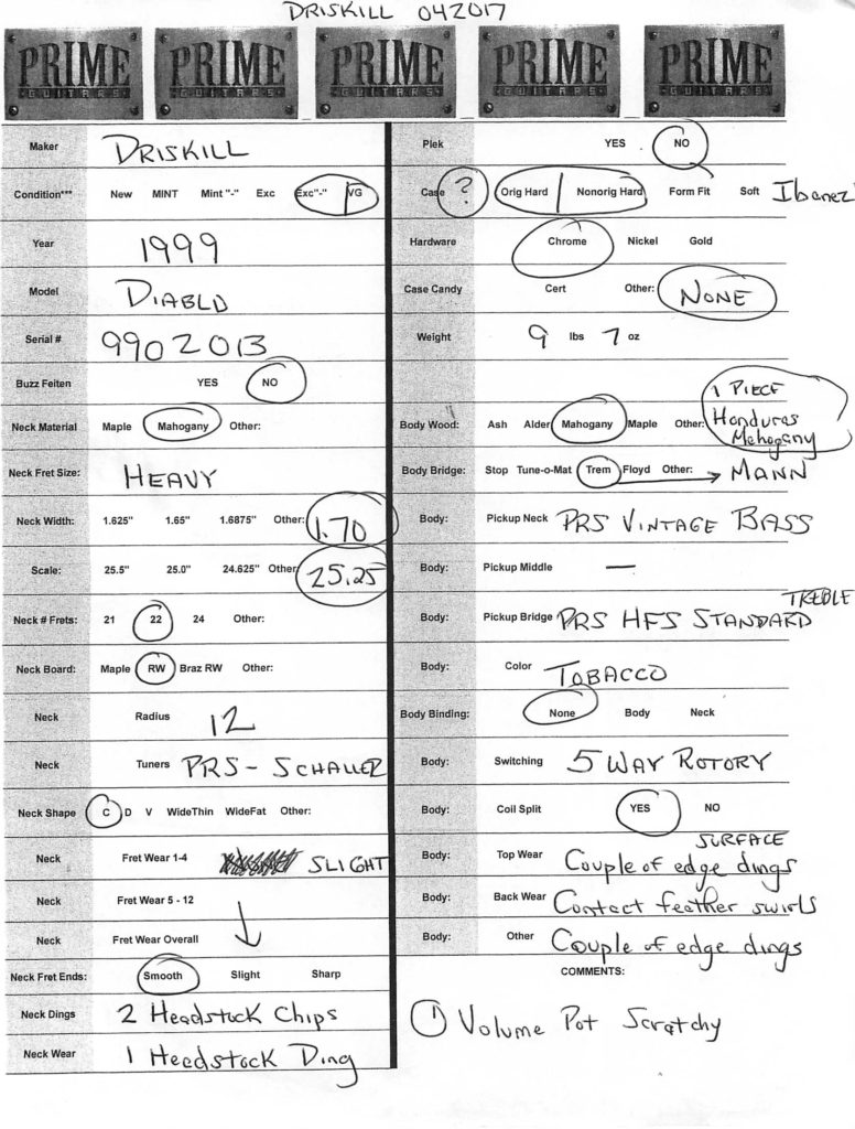 Rare Early DRISKILL Diablo. This was hand crafted by Joe himself before he started making his own hardware! Check out the Abalone Dots! 1-Piece Honduran Mahogany Body! Mann Trem. PRS Tuners! PRS Vintage Bass & HFS Standard Treble Pickups (Early Ones too!). 5-Way Rotory Switch.