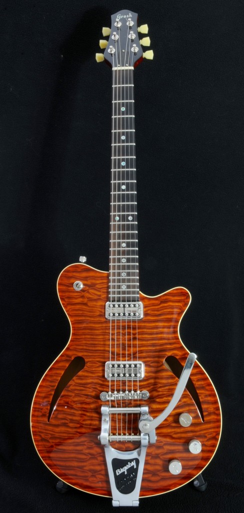 The Hollowtron is my favorite model. These are extremely rare because of the intense labor to create. New these are in the upper-$6ks with a very long wait…and compared to other contenders these are worth every penny. Used the Hollowtron is a steal. The finest quilt maple top. BRAZILIAN BOARD (with CITIES Paperwork). TV Jones Pickups. Just 7lb-10oz. A perfect balance of woods and weight.