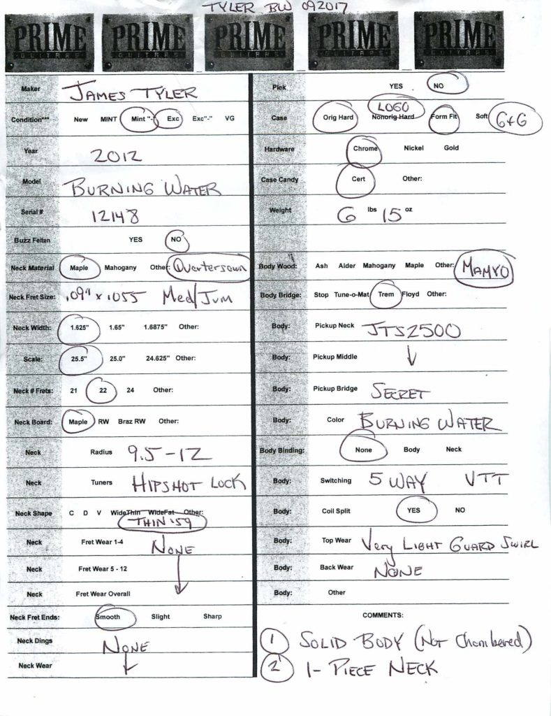 James Tyler Burning Water! One of the most iconic guitars of the boutique revolution. There is just something about the feel of a Tyler neck. Quartersawn, 1-Piece, satin finish..scallopped edges….mmmmm just feels perfect. Probably my single favorite neck. This one features a Mamyo Body (Solid not chambered).