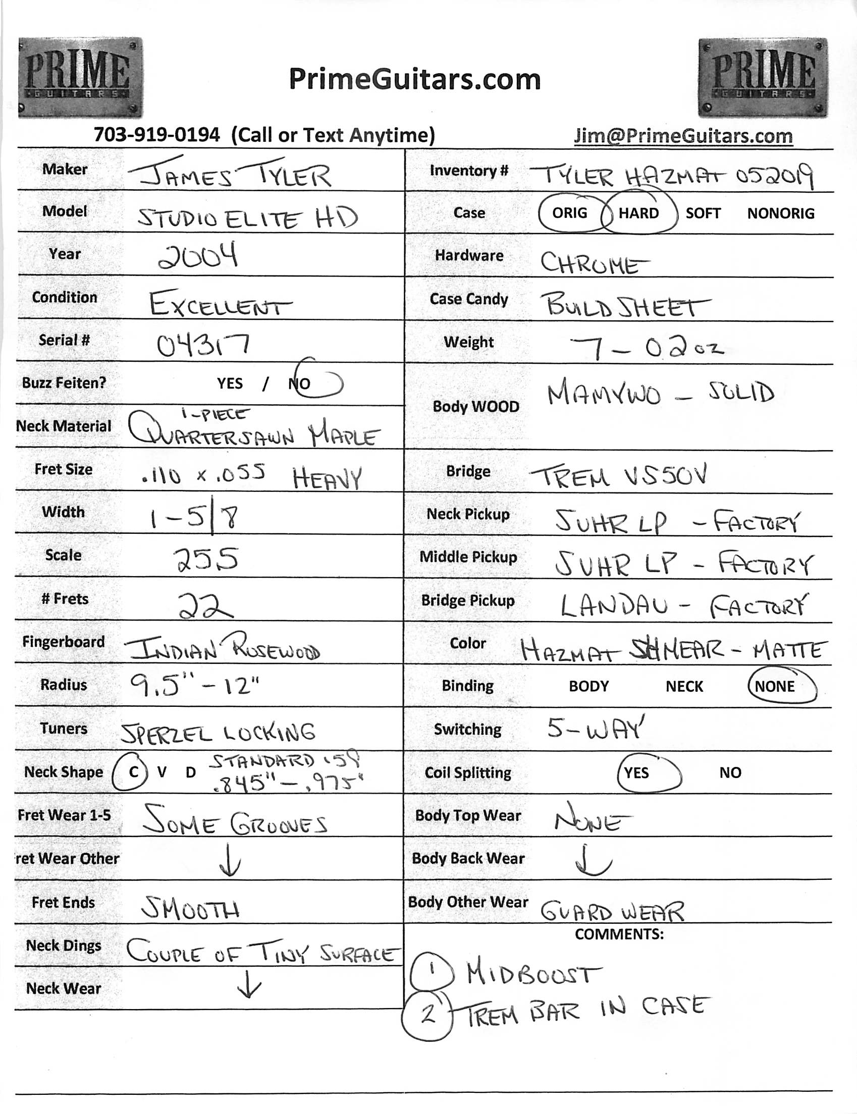 James Tyler USA (don’t you hate when guys just say James Tyler then like 1232 paragraphs down you learn it’s a Japanese el cheapo version…). From the early days of 2004 when James found cool pickups everywhere and used them. This one features Suhr LP single coils from the factory….the USA factory…yeah…and a Laundau Secret from the factory….so let me be clear….it is STOCK…LOL…but we know you will still have to email and ask ‘ahhhhhhhh…ahhhhhh. I know you said stock but can you call james at 6pm on Sunday and ask him if he remembers this guitar and if the pickups are stock”. Well the customer is always right…until they aren’t…so we refuse….LOL.