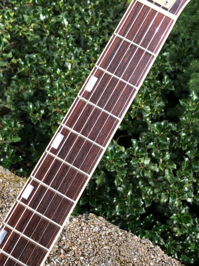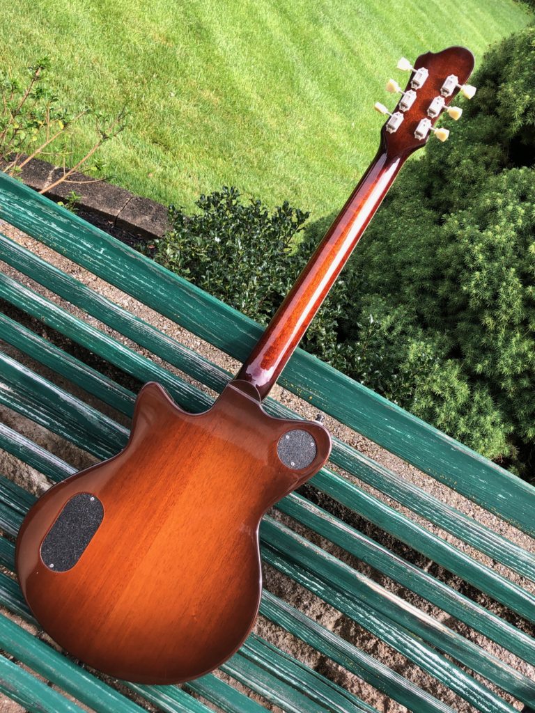 This clean 2005 Duo Glide is from a smoke free environment and comes with its original hardshell case. It weighs just 6lb-5oz. Just LOOK at how the quilted maple top POPS. The neck is a full yet comfortable .835″ – .985″ “C”. The board is Brazilian Rosewood.