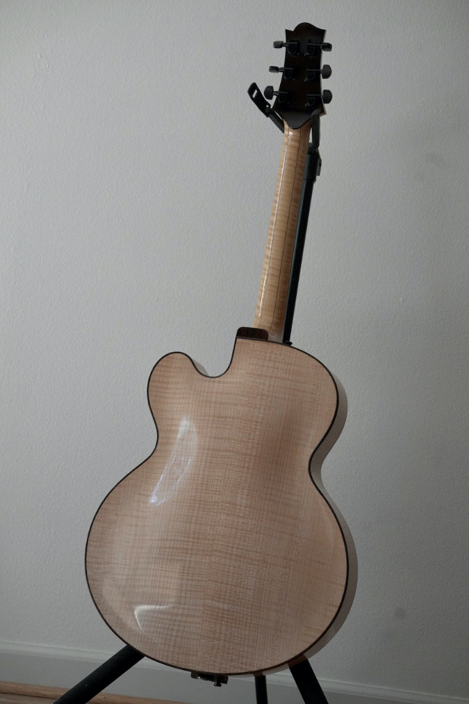 Taku Sakashta masterpiece! An impossibly rare custom 17″ Archtop from a 1-owner collection. Amazing story accompanies this piece. The owner inherited a Brazilian Rosewood bed; Taku was SO interested in the wood that he took in the entire bed in partial exchange for this piece. SO this very guitar has genuine FURNITURE GRADE BRAZILIAN ROSEWOOD ! Taku used the rest of the wood in other pieces. The top is German Spruce.