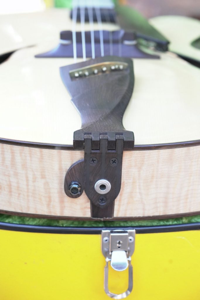 The tailpiece is totally floating and it is custom created to match the curvature of the top & allow for a strap.